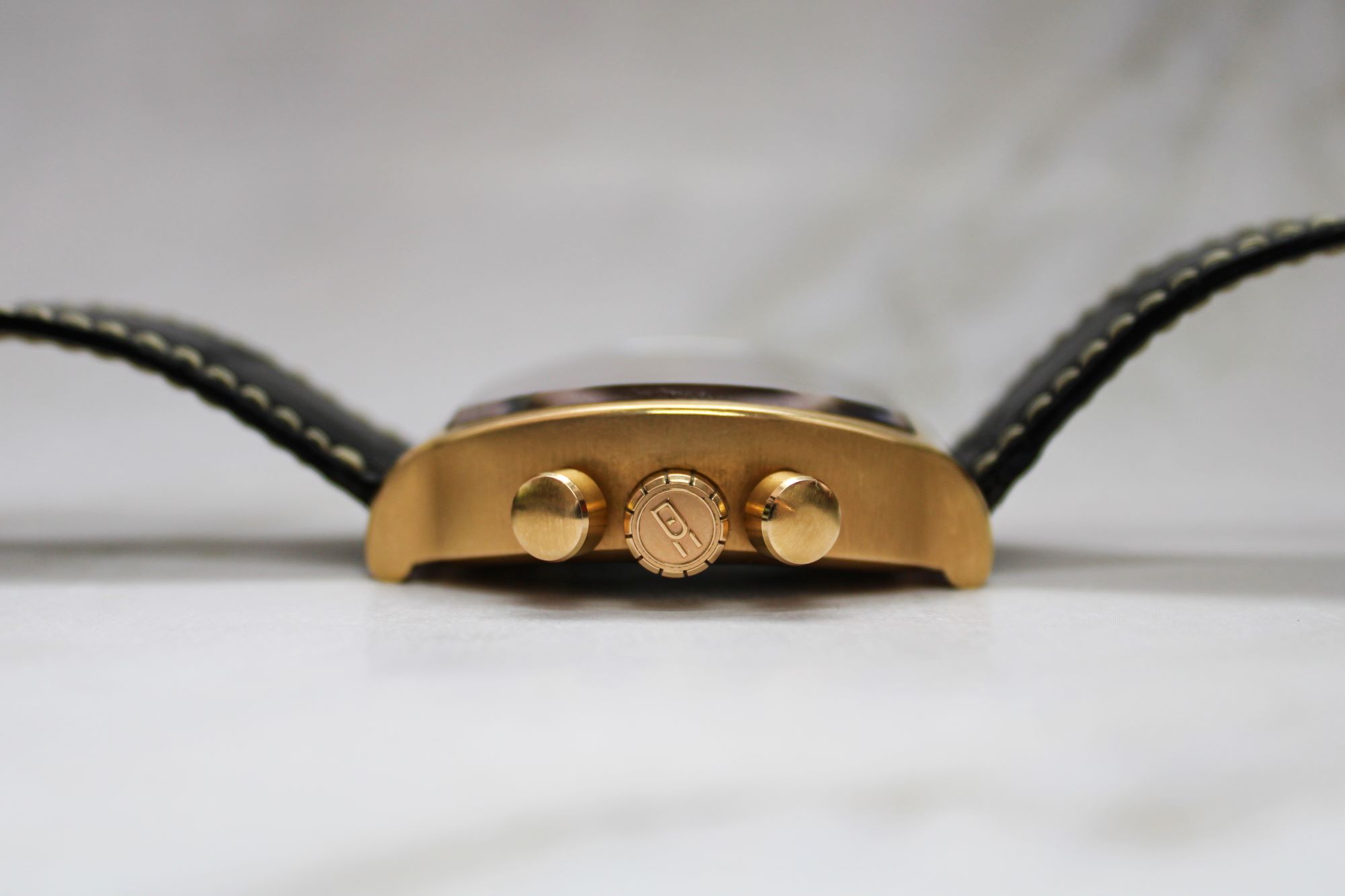 CaseLarge tonneau case in 18k rose gold, brushed and polished, fixed bezel in 18k rose gold, brushed, caseback fixed on 8 screws, with two round sapphire crystal windows at 3 and 9 o’clock, ‘DeLaCour Bichrono Limited Edition Swiss Crafted’, case and limited-edition numbers engraved, winding crowns with embossed ‘DC’ logo at 3 and 9 o’clock, ‘pump’ chronographs pushers at 2, 4, 8 and 10 o’clock