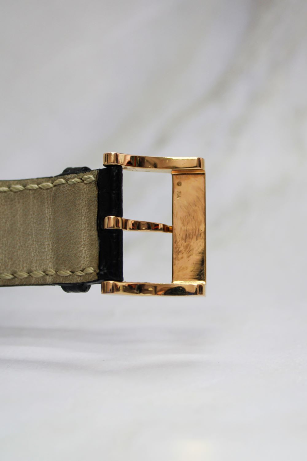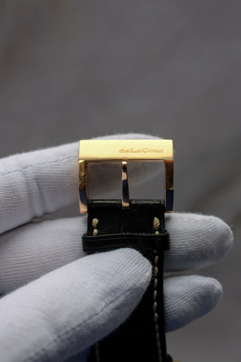 StrapBlack alligator strap with white stitching, signed ‘DeLaCour’, pin buckle in 18k rose gold with DeLaCour logo engraved