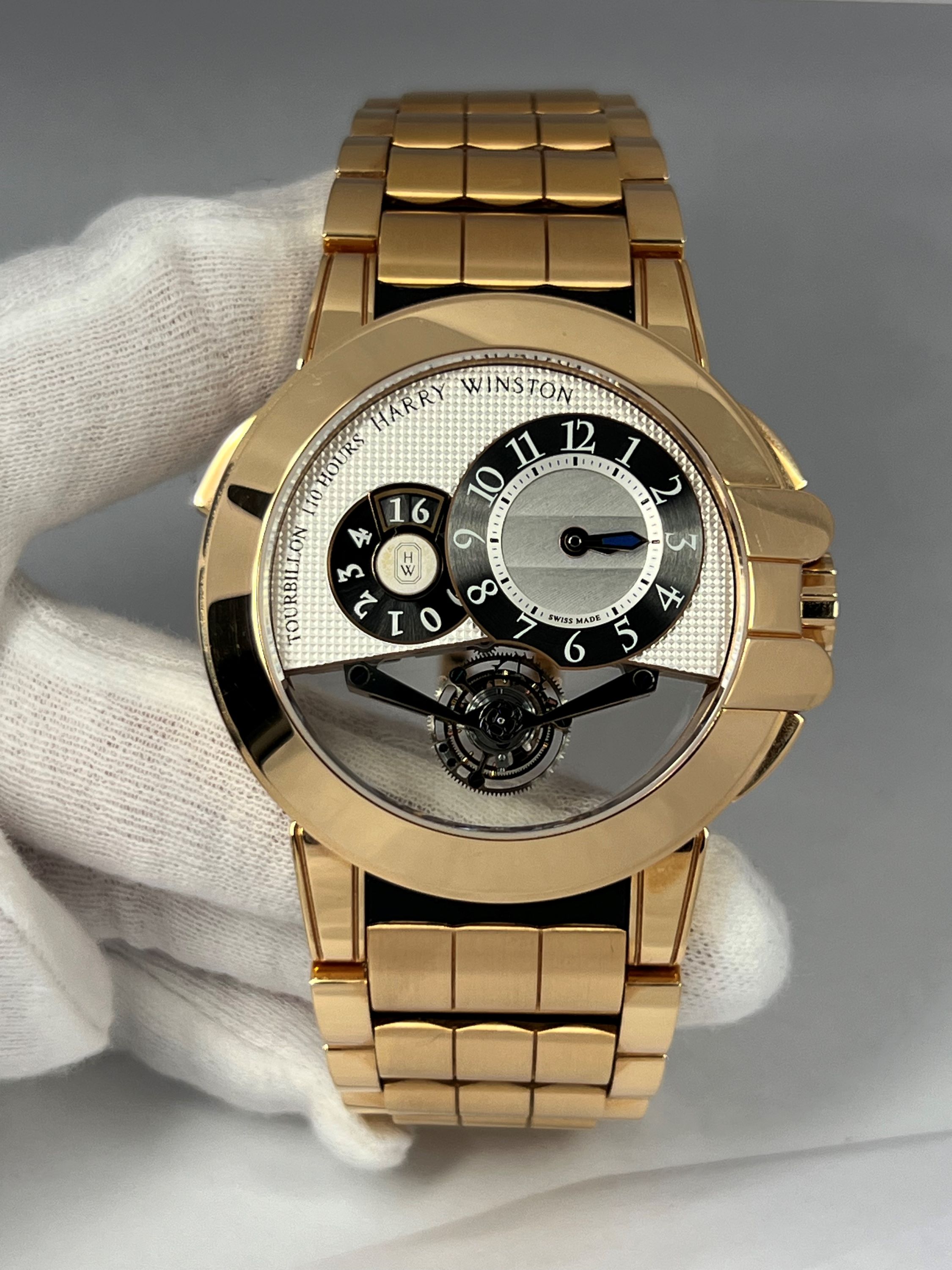 CaseRound case in 18k rose gold, polished, fixed bezel in 18k rose gold, polished, exhibition caseback fixed on 8 screws, with Harry Winston logo, case number and reference engraved, winding crown at 3 o’clock between protective shoulders of the case with embossed ‘HW’ logo, pusher to set the big date at 10 o’clock