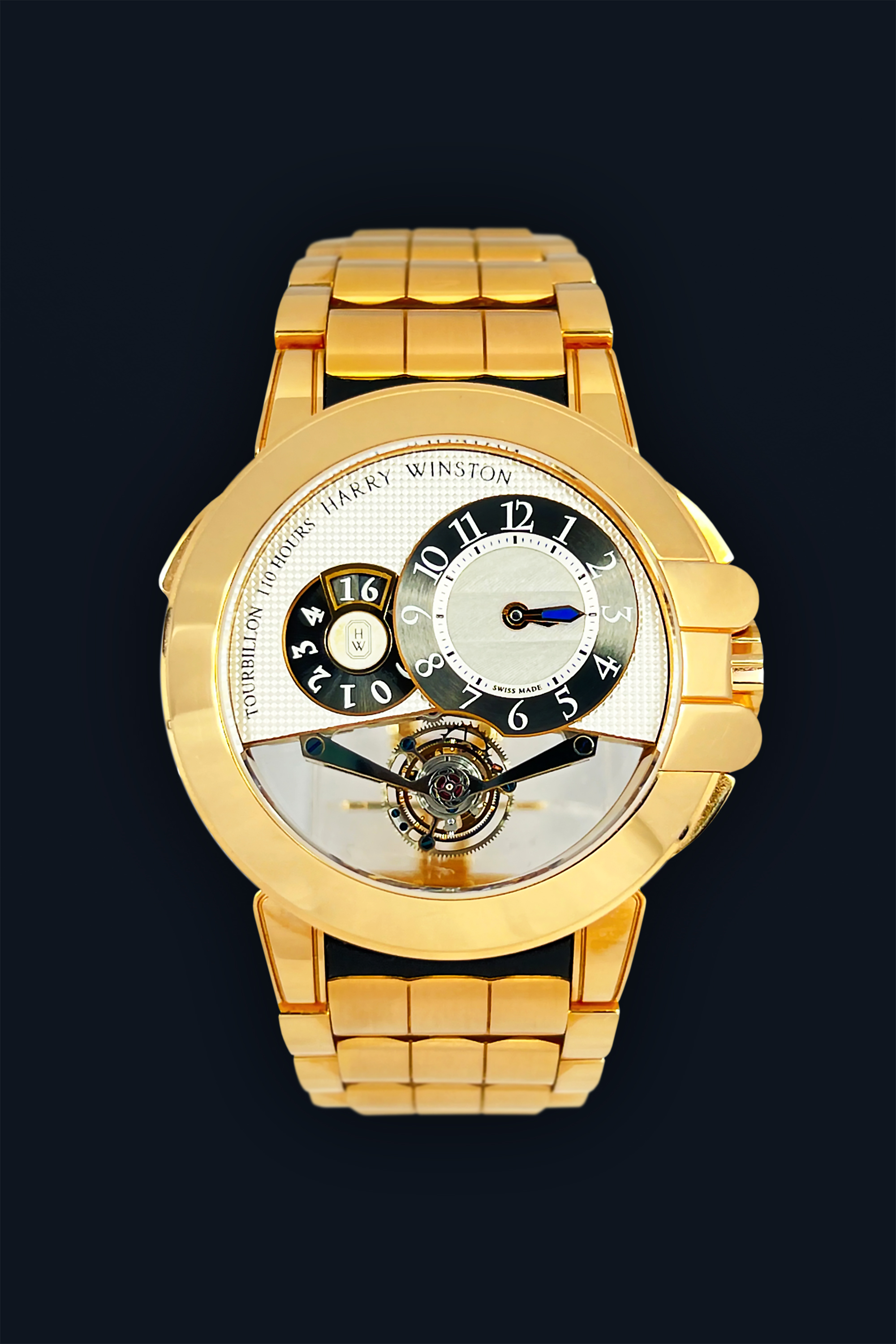 DialSilvered dial with guilloche Clous de Paris pattern, signed ‘Harry Winston Tourbillon 110 Hours’, off-centre main time sub-dial at 2 o’clock with black chapter ring, brushed, white Arabic numerals, ‘sword’ hour and minute hands with blue luminous compound, central zone with Cotes de Geneve, big date display at 10 o’clock with ‘HW emerald’ logo, sector opening of tourbillon at 6 o’clock