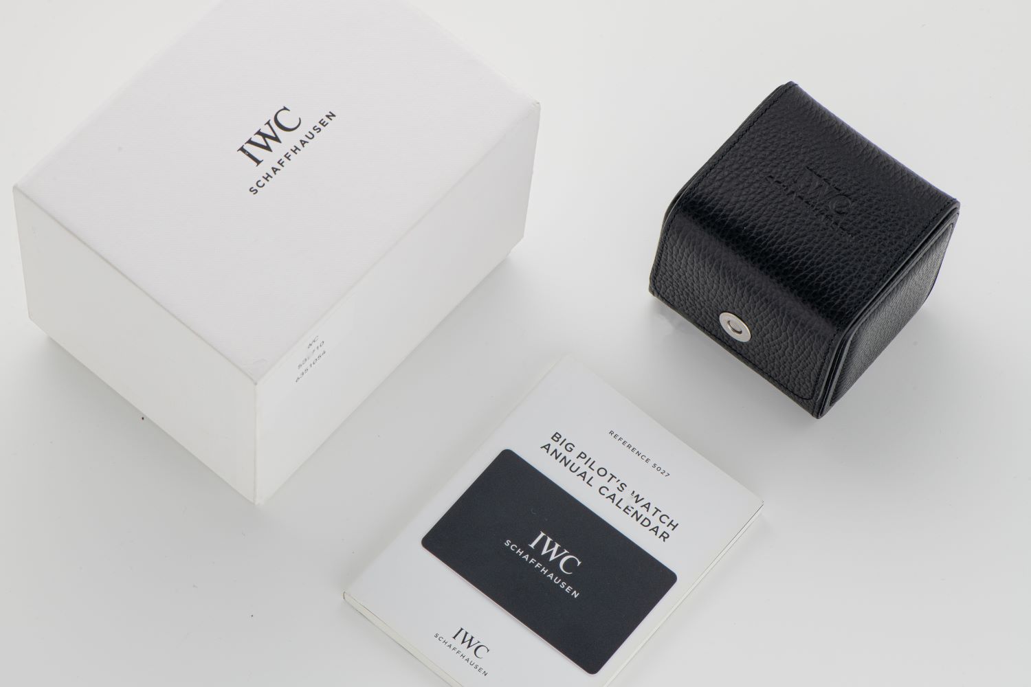 DialBlue sunburst dial with printed luminous numerals, large luminous sword hands, small seconds at 9 o'clock, power reserve indicator at 3 o'clock, day, date, and month at 12 o'clock, signed 'IWC' at 6 o'clock