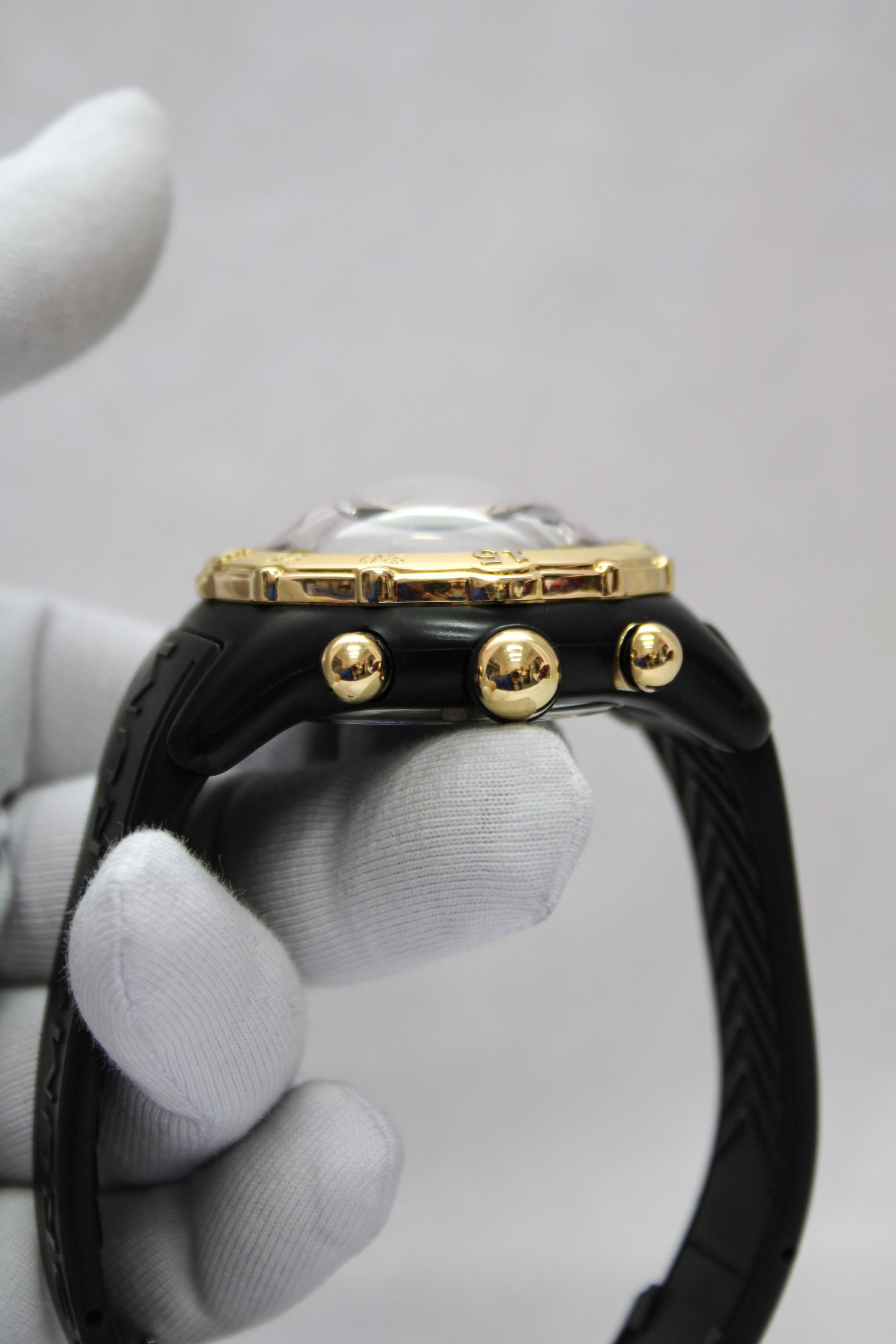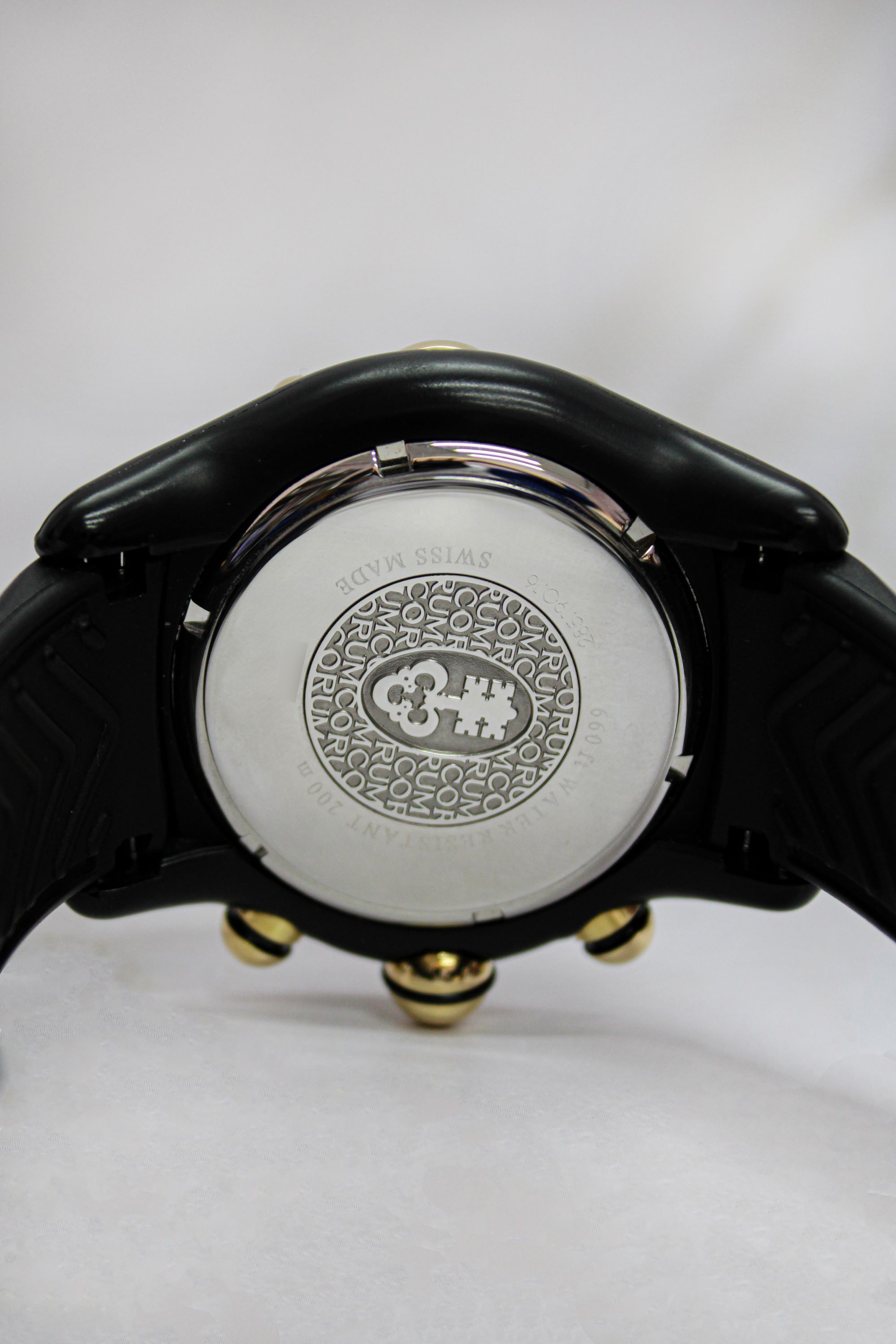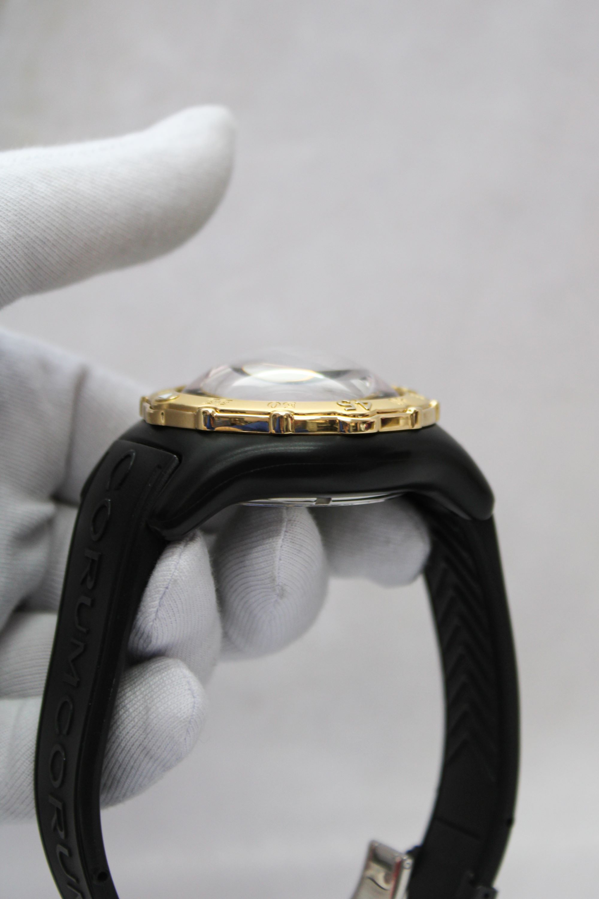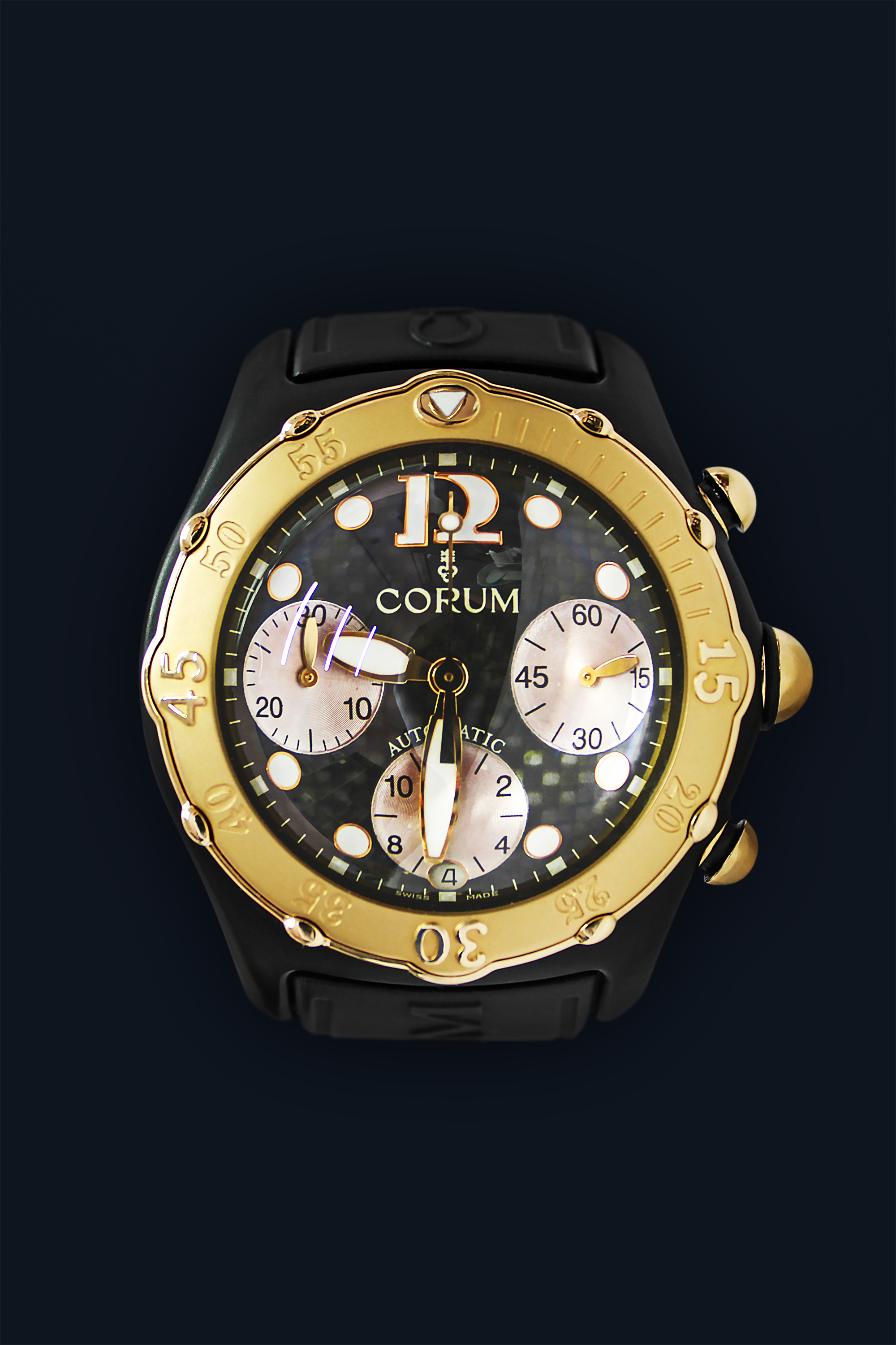 CaseRound case in black PVD-coated stainless steel, polished, unidirectional turning bezel in 18k yellow gold with diver’s minute track in relief and zero luminous marker, thick spherical sapphire crystal, screw-down solid stainless steel caseback with Corum logo and ‘key pointing skywards’ emblem embossed, reference and case number engraved, spherical ‘bubble’ winding crown at 3 o’clock in 18k yellow gold with rubber ring, ‘bubble’ chrono pushers at 2 and 4 o’clock in 18k yellow gold with rubber ring