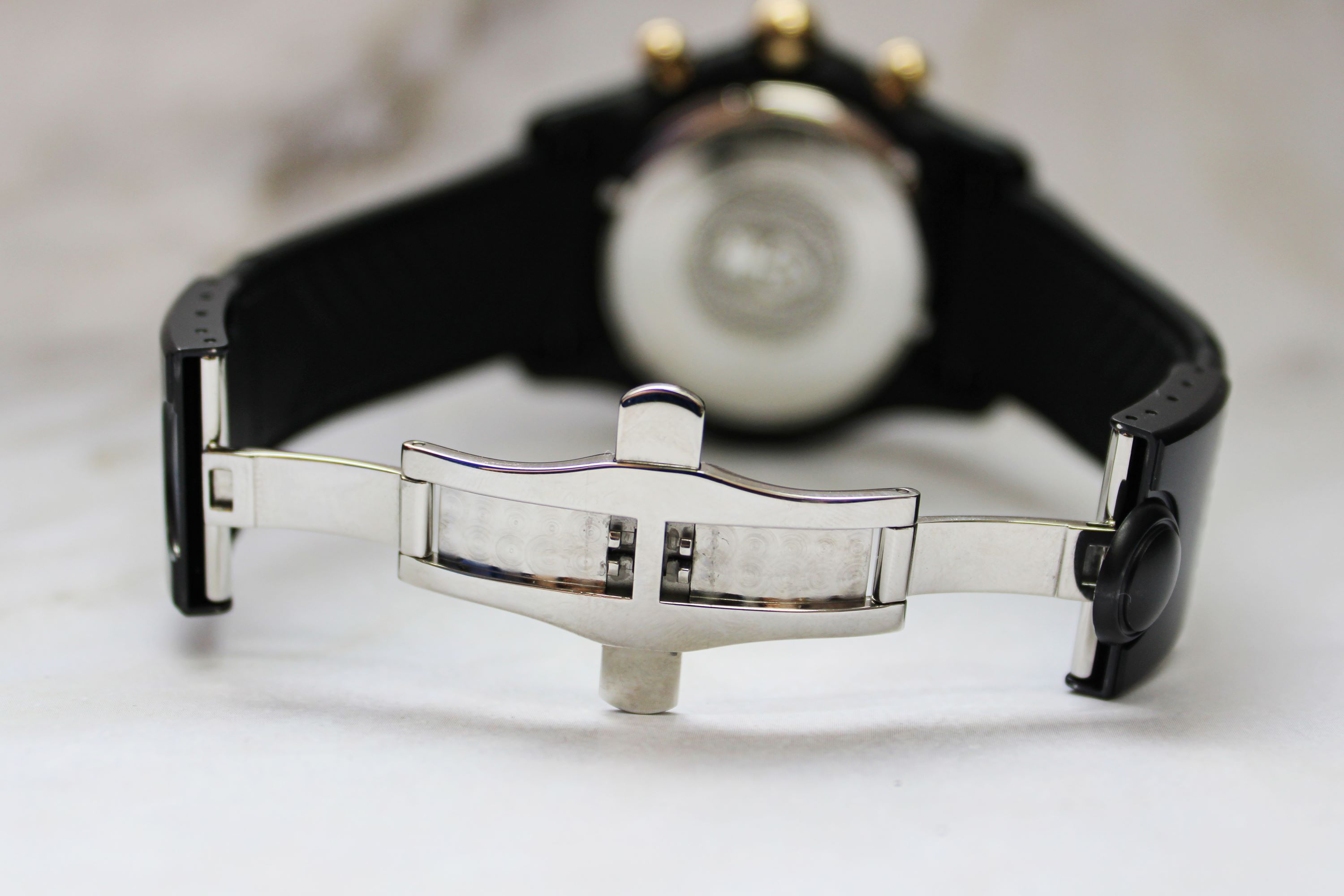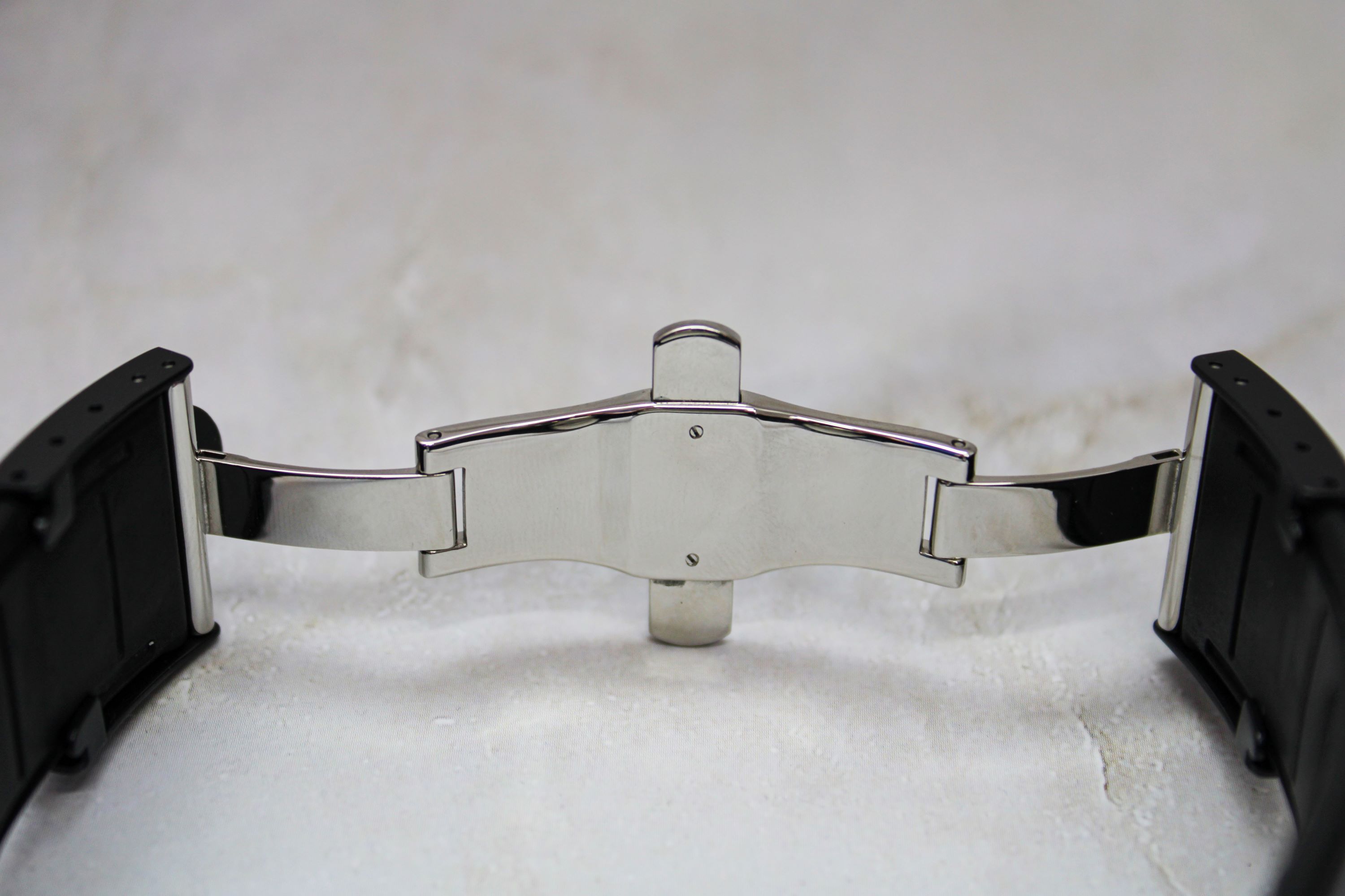 StrapBlack rubber strap, signed Corum in relief, triple folding clasp in stainless steel and black PVD-coated stainless steel, with ‘bubble’ pushbutton