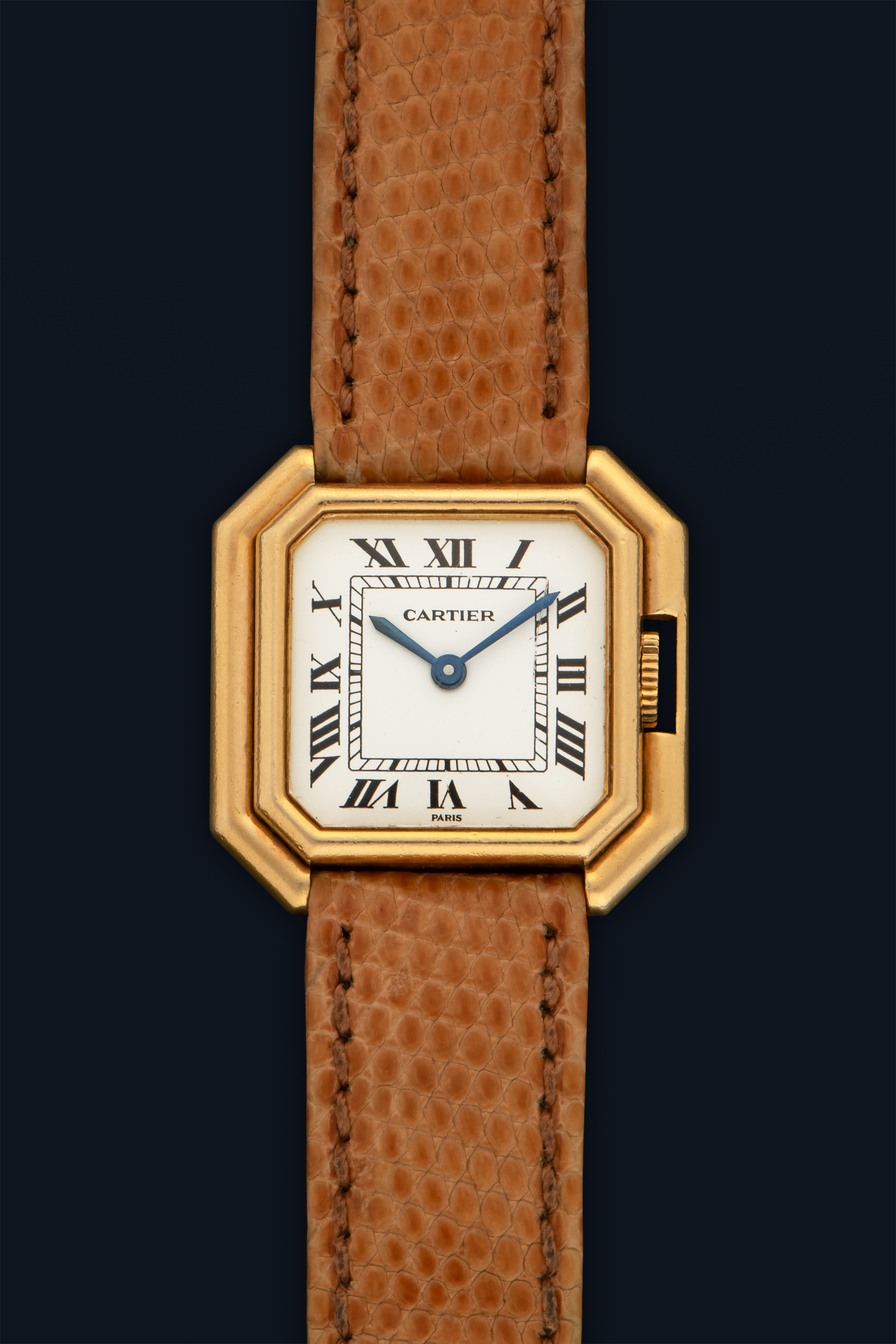 DialWhite lacquer dial with roman numerals, heat-blued sword hands, signed 'Cartier' at 12 o'clock