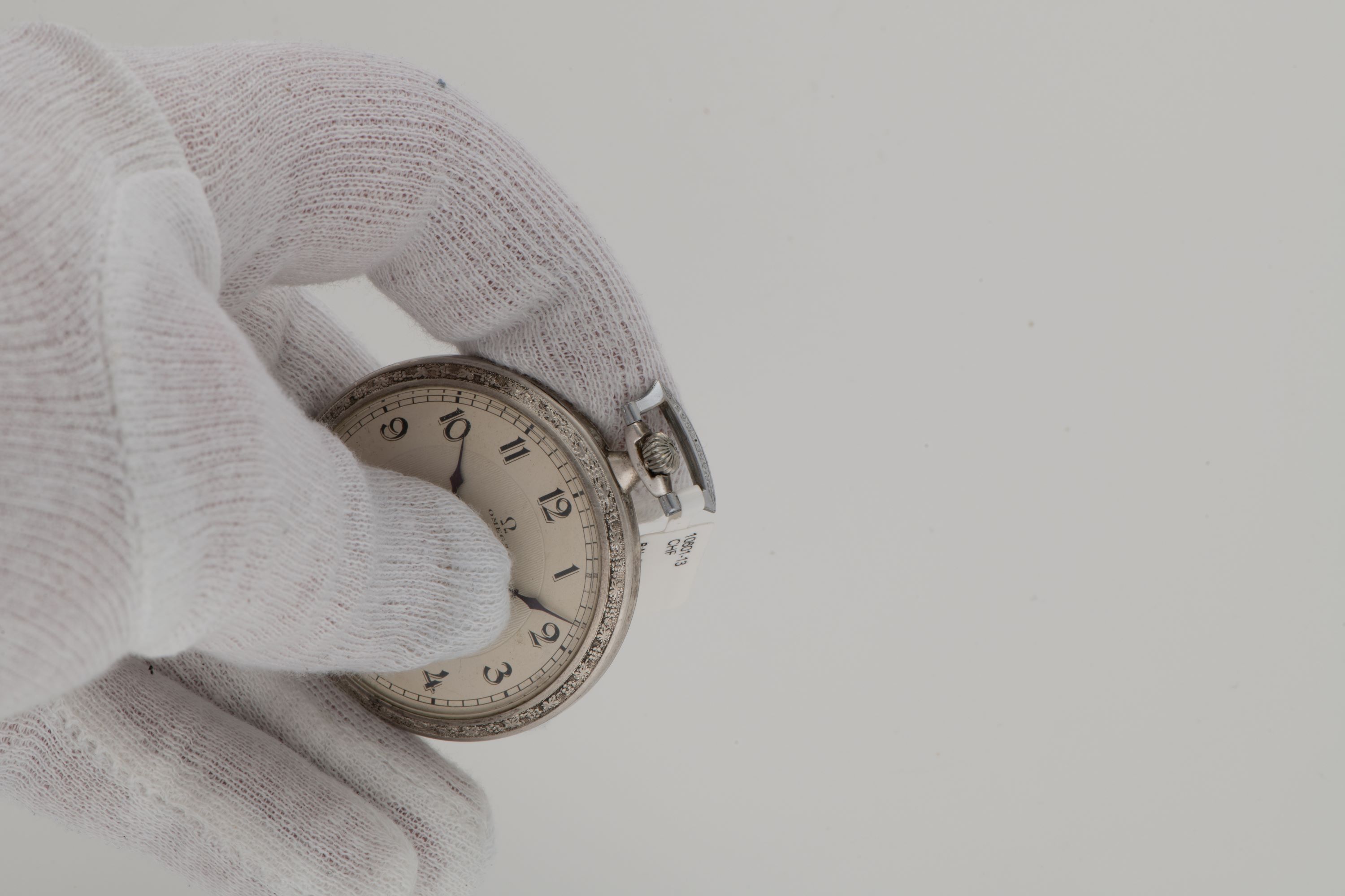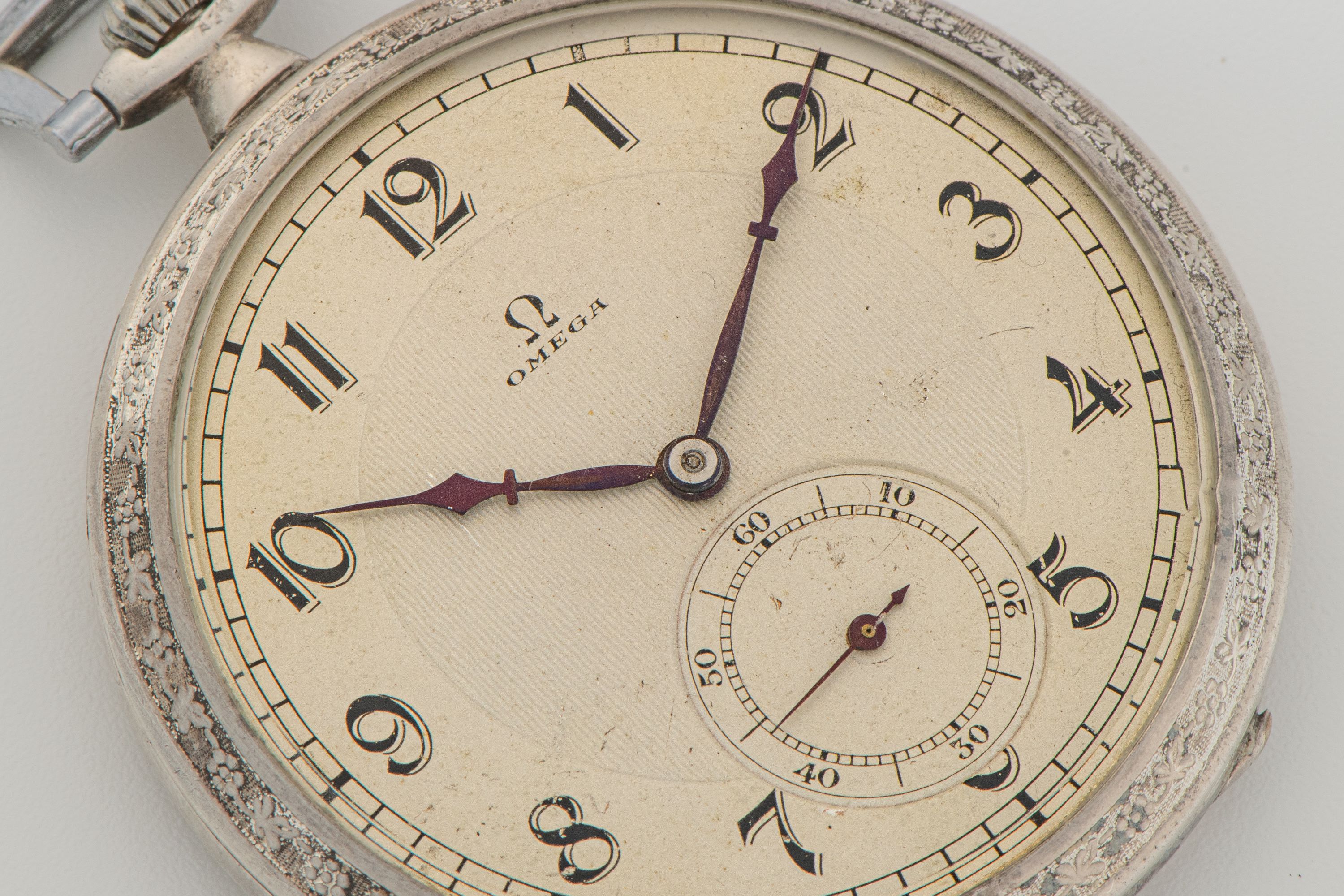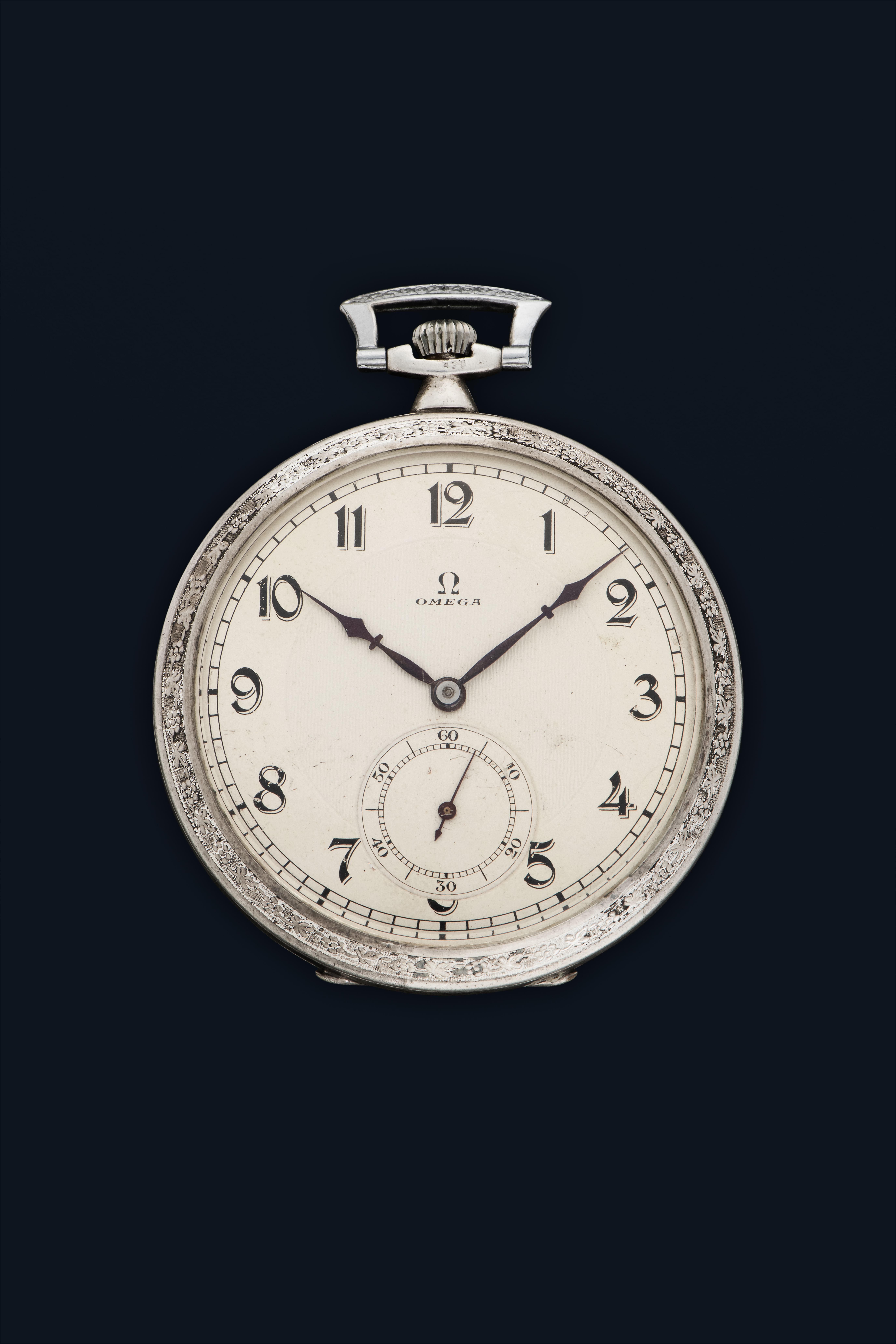 DialSilver-white guilloche dial with stylized numerals, heat-blued hands, small seconds at 6 o'clock, signed 'Omega' at 12 o'clock