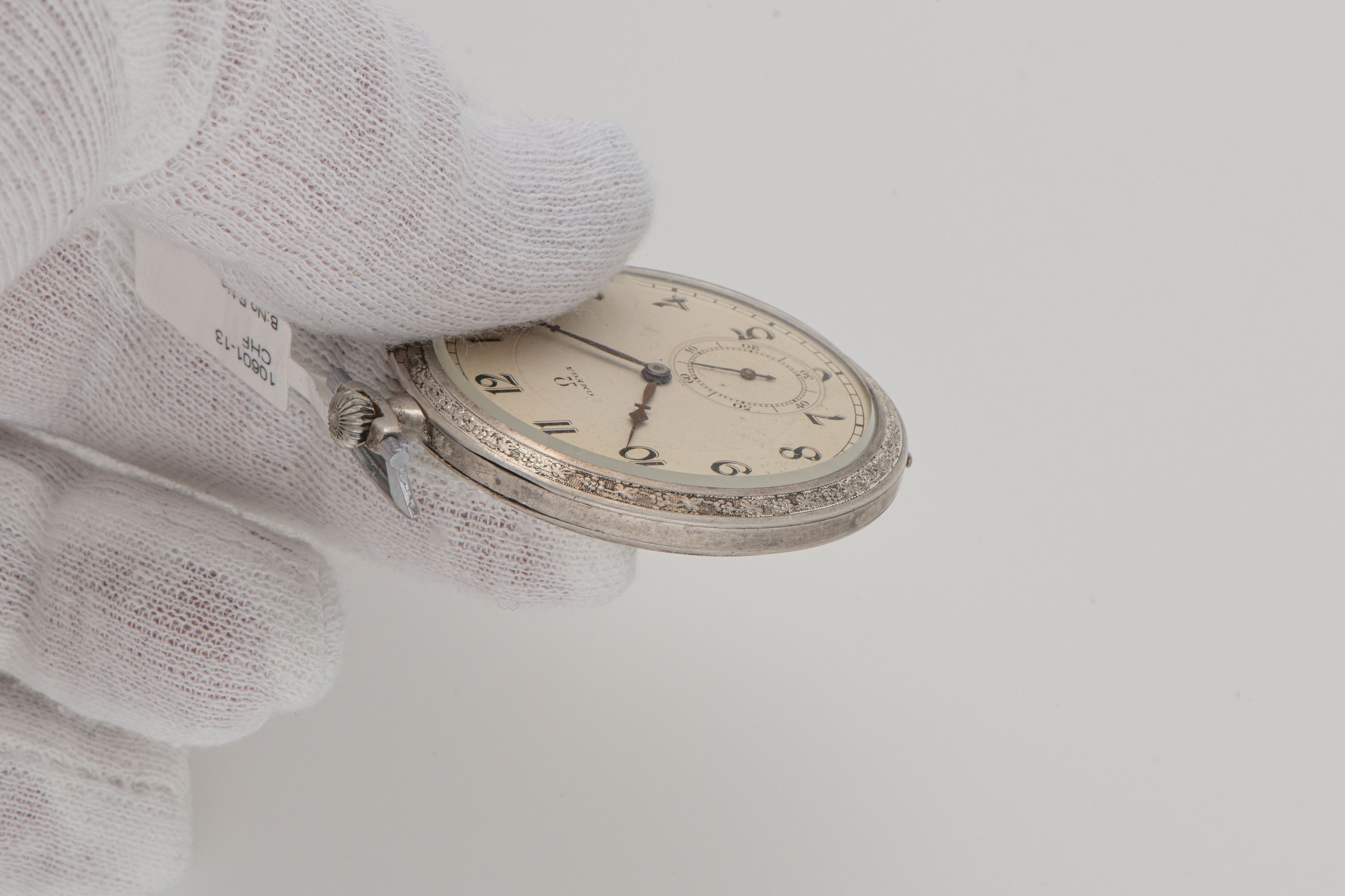 CaseRound case in silver 900 with floral decoration, replaced matching chain hook in steel at 12 o'clock, winding crown at 12 o'clock