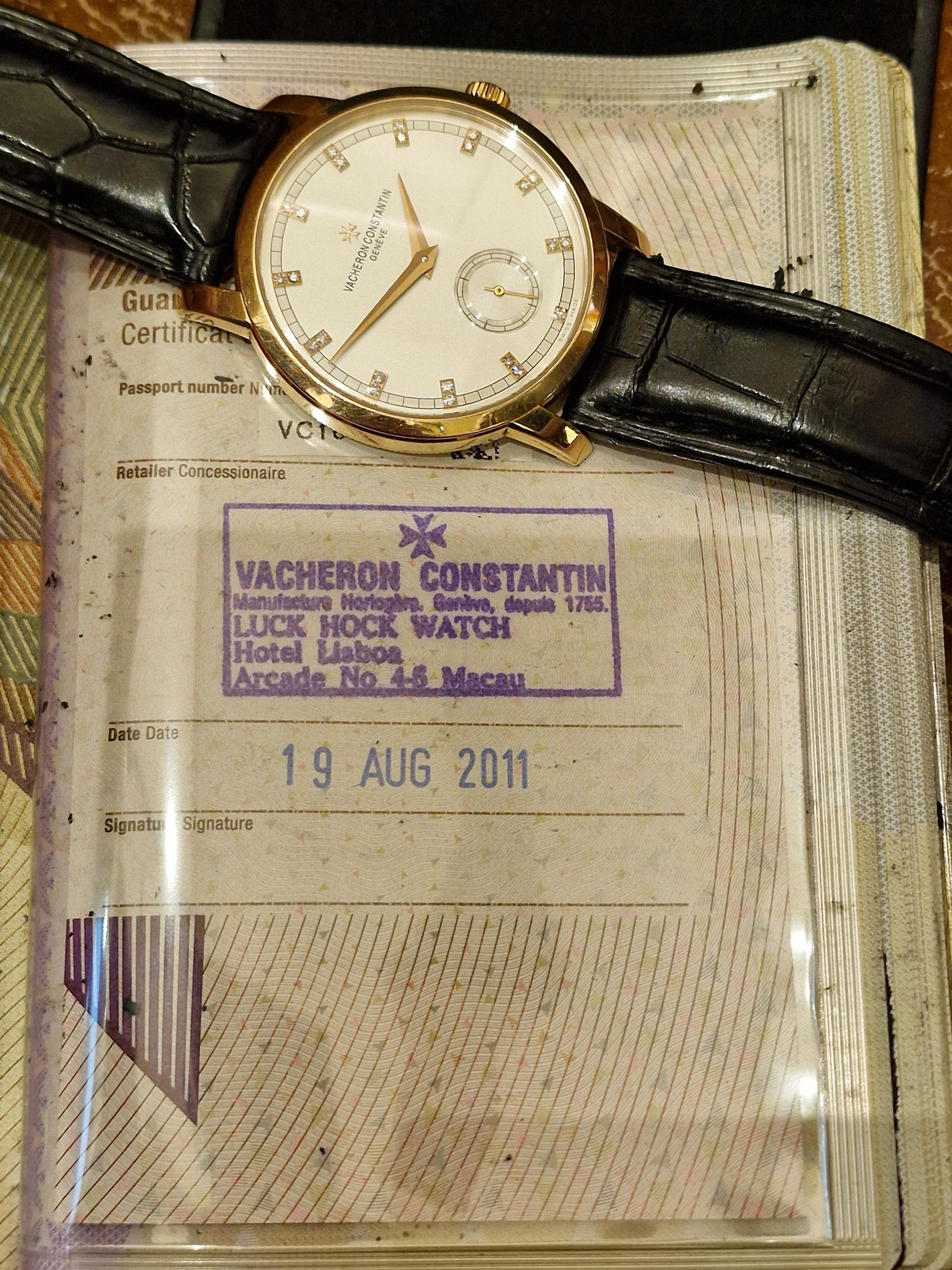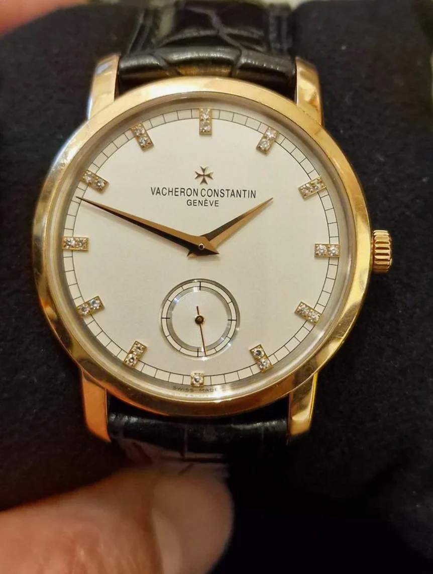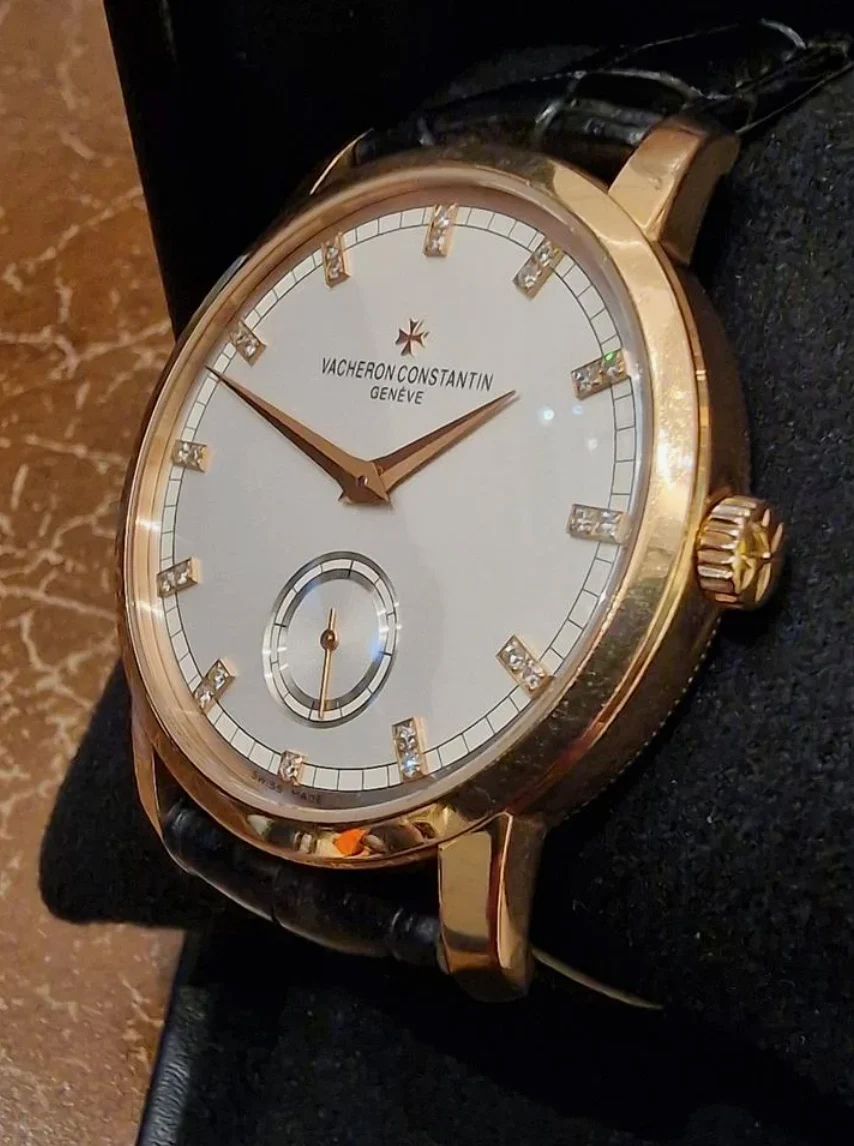 DialWhite matte silvered dial, signed ‘Vacheron Constantin Geneve’, applied rose gold Maltese cross at 12 o’clock, ‘Dauphine’ hour and minute hands, applied rose gold diamond Indexes, recessed sub-dial of small seconds at 6 o’clock, outer “railway” minute track