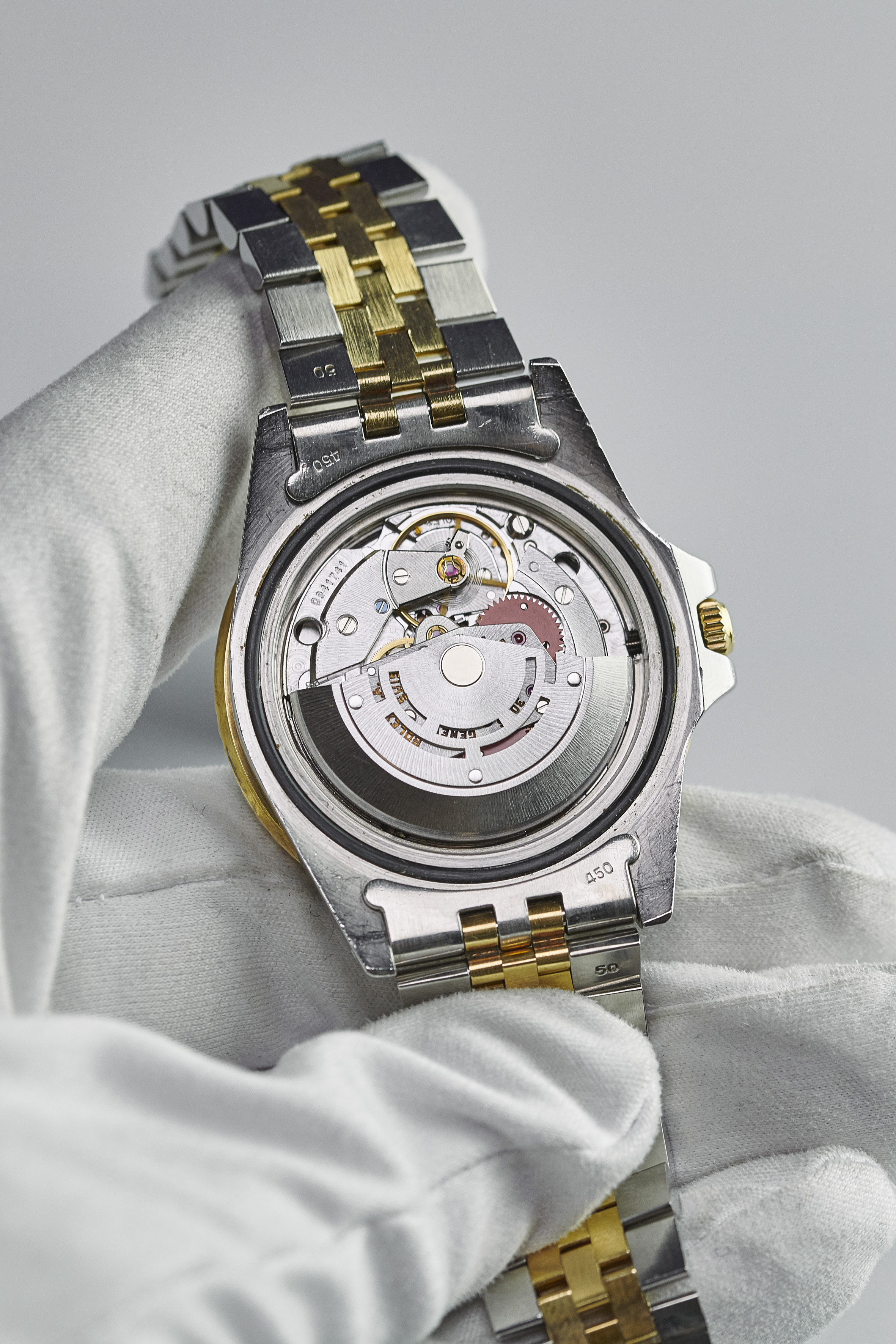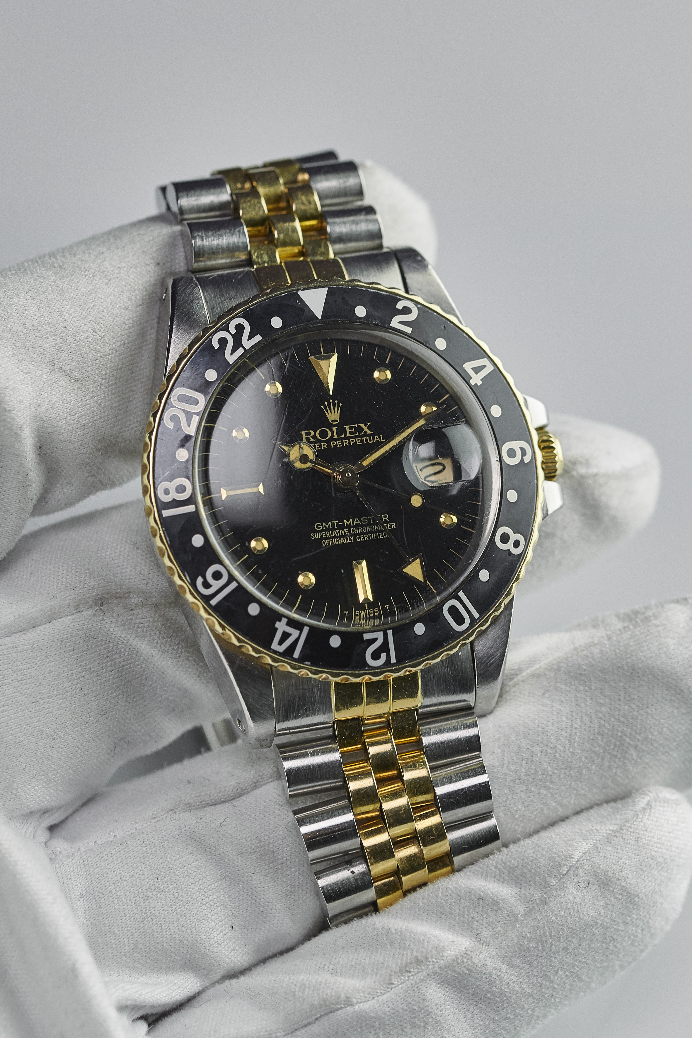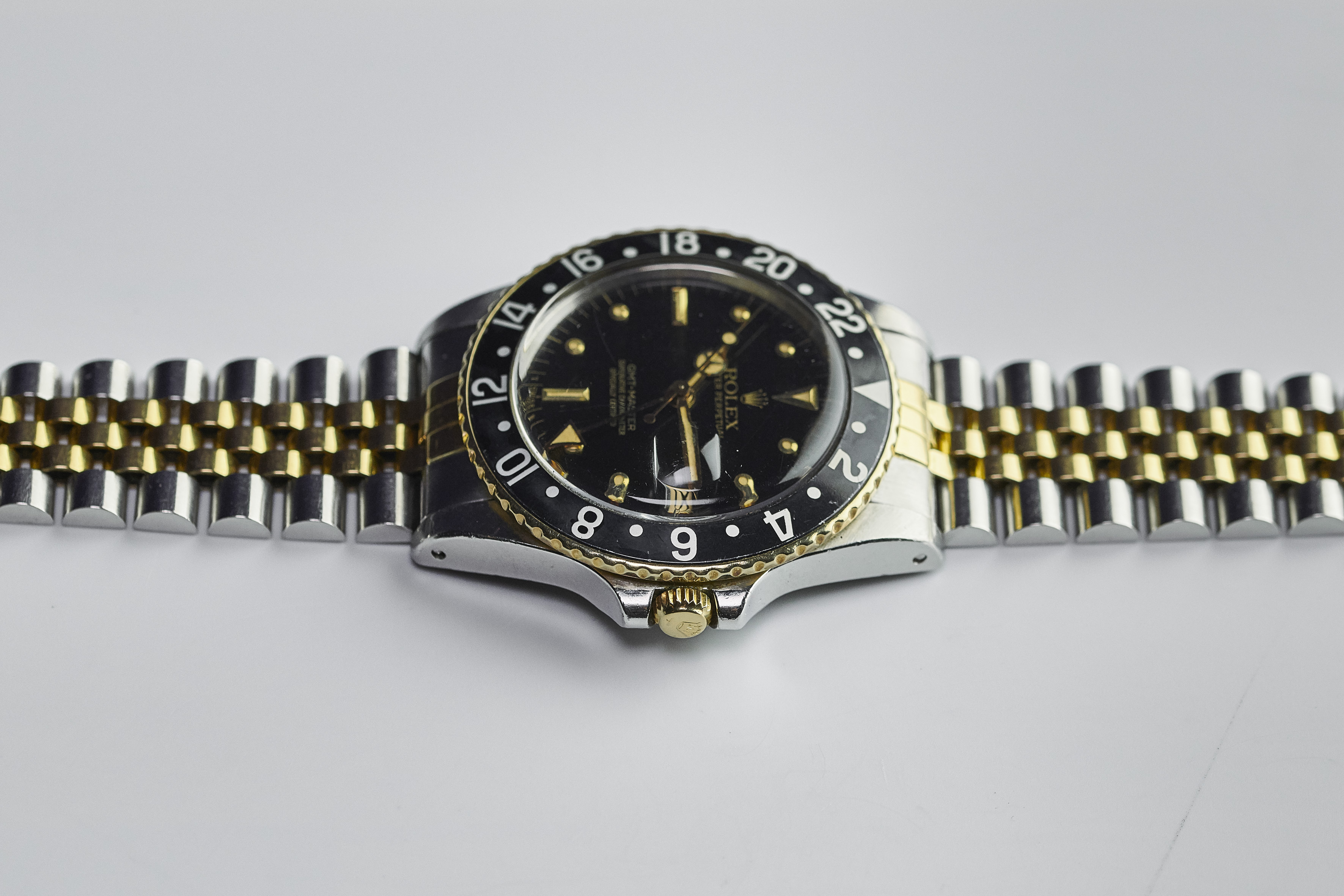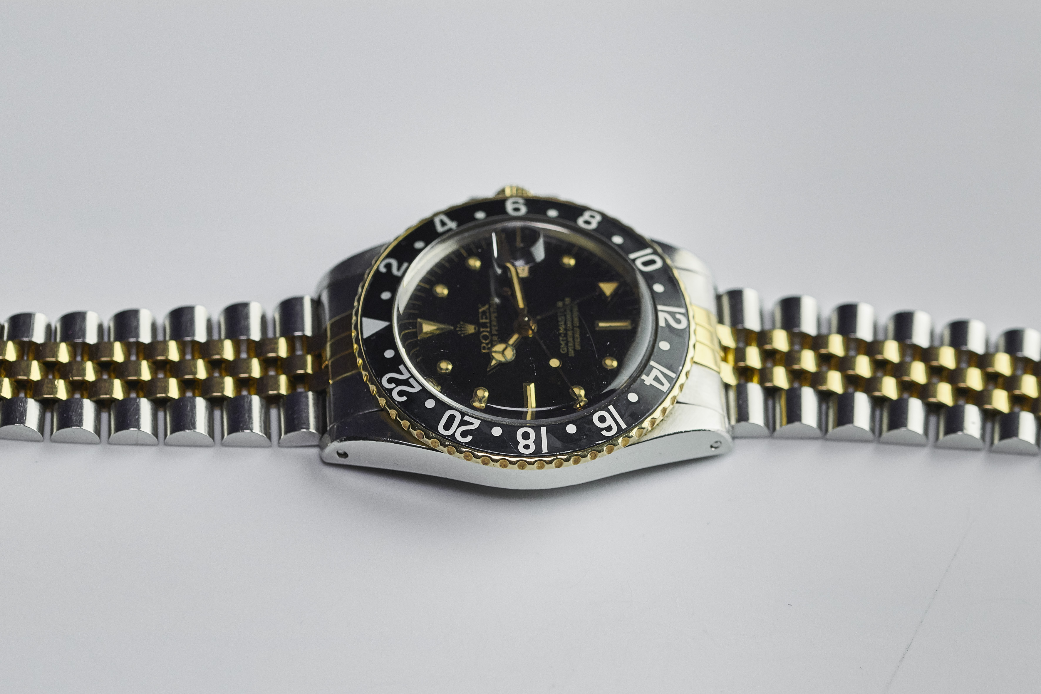 • Dial Black dial with applied gold-coloured "nipple" indices, date with magnifying glass at 3 o'clock, gold-coloured 24-hour hand, bi-directional rotating black gold-set 24-hour bezel, signed "Rolex GMT Master II"