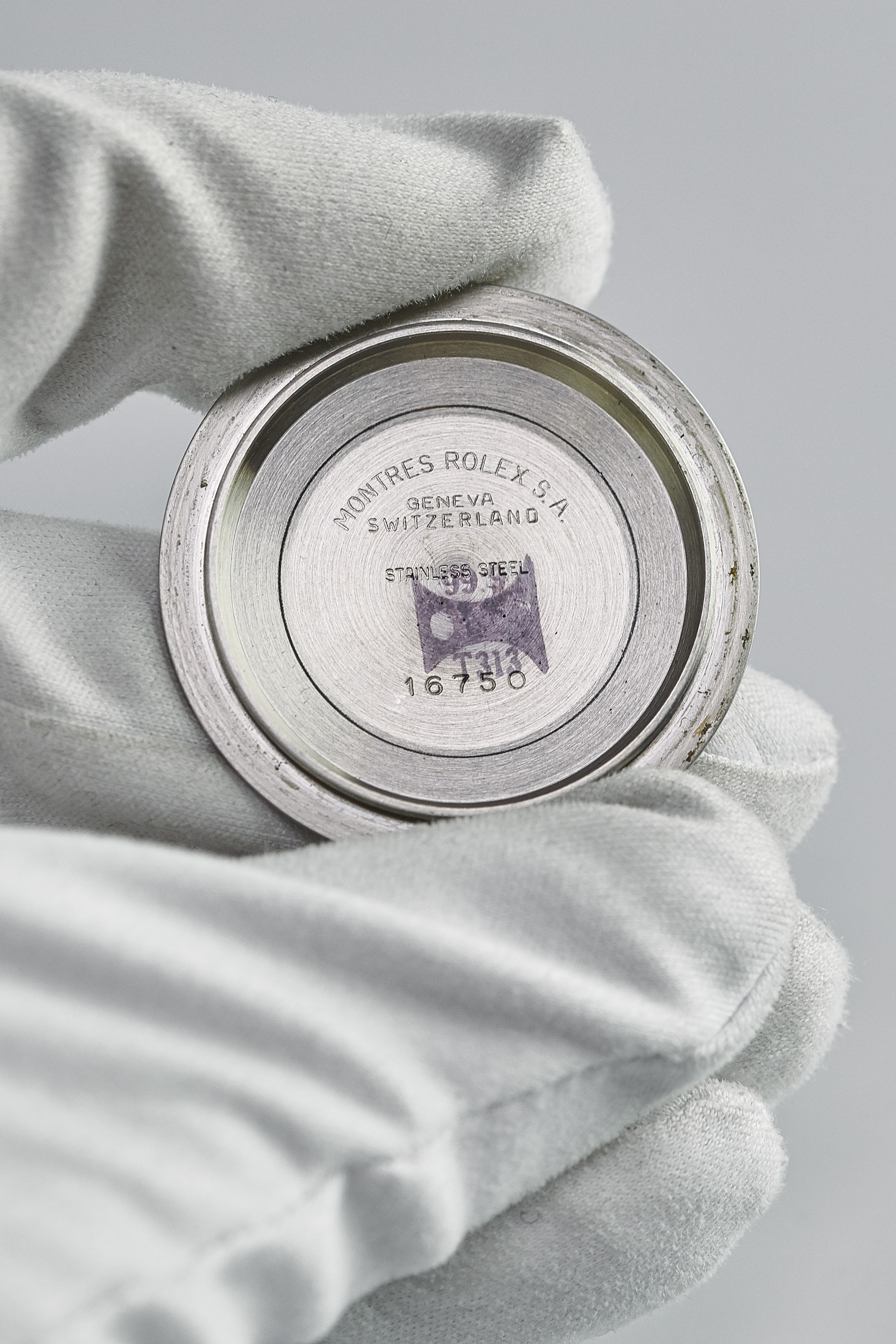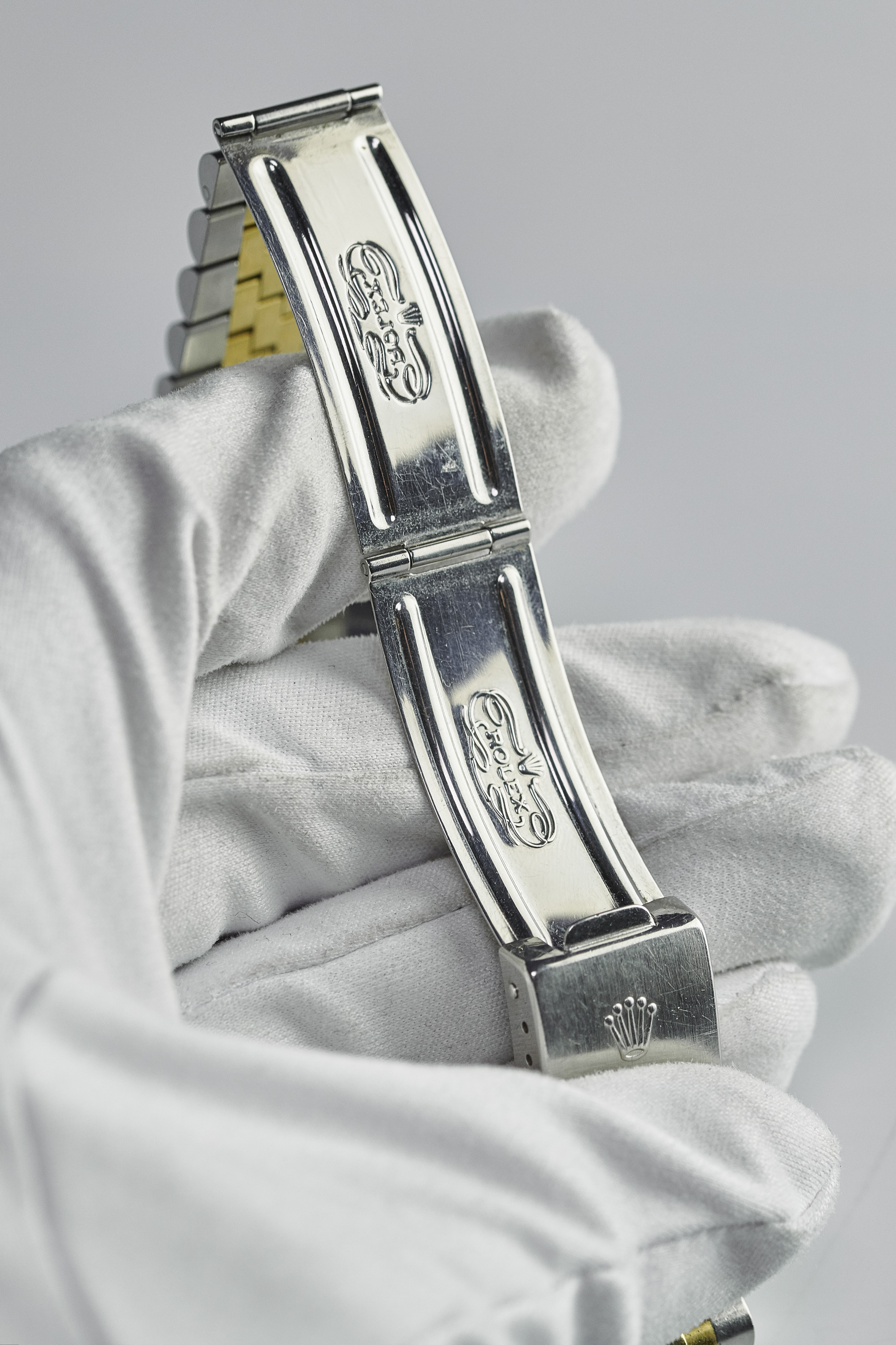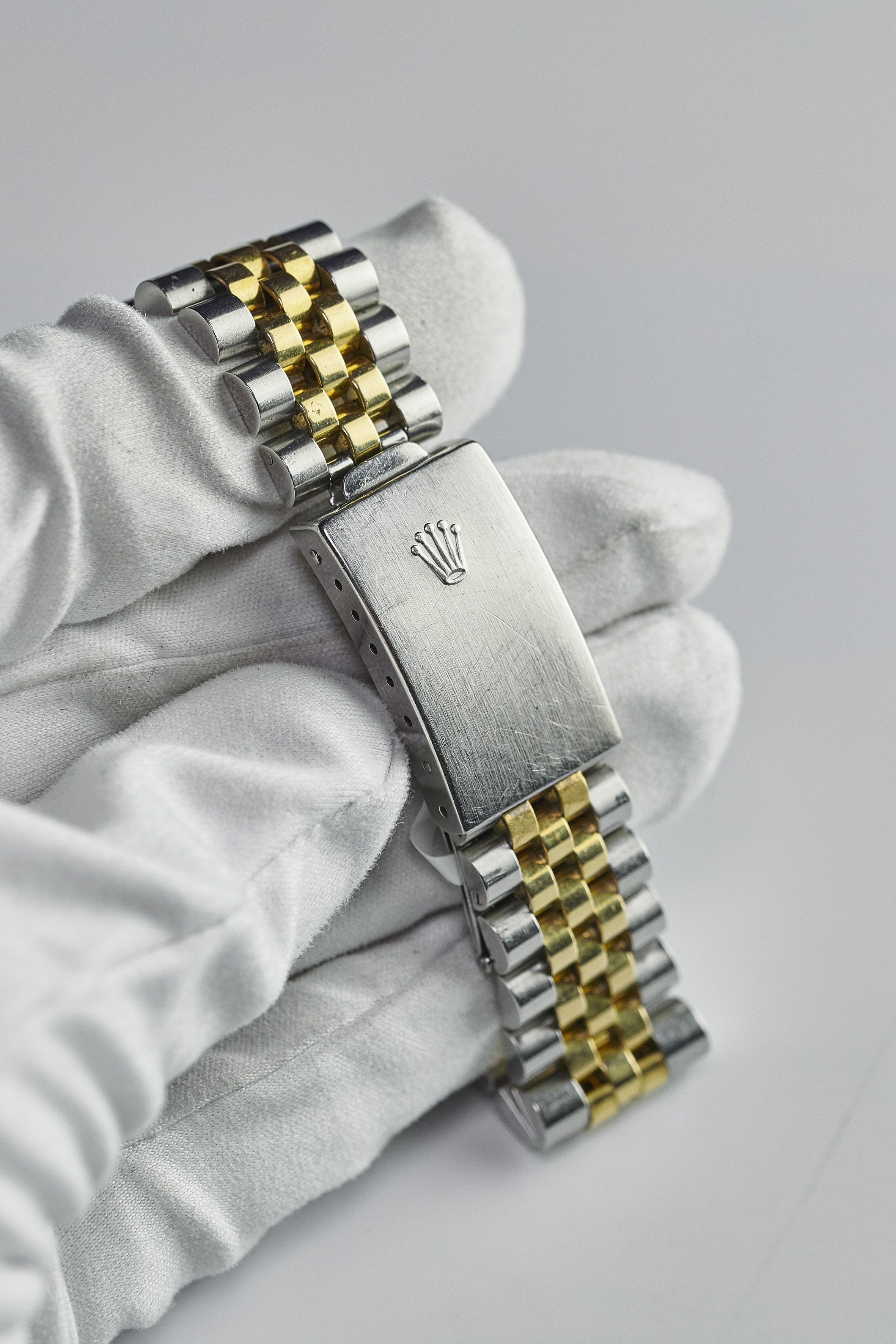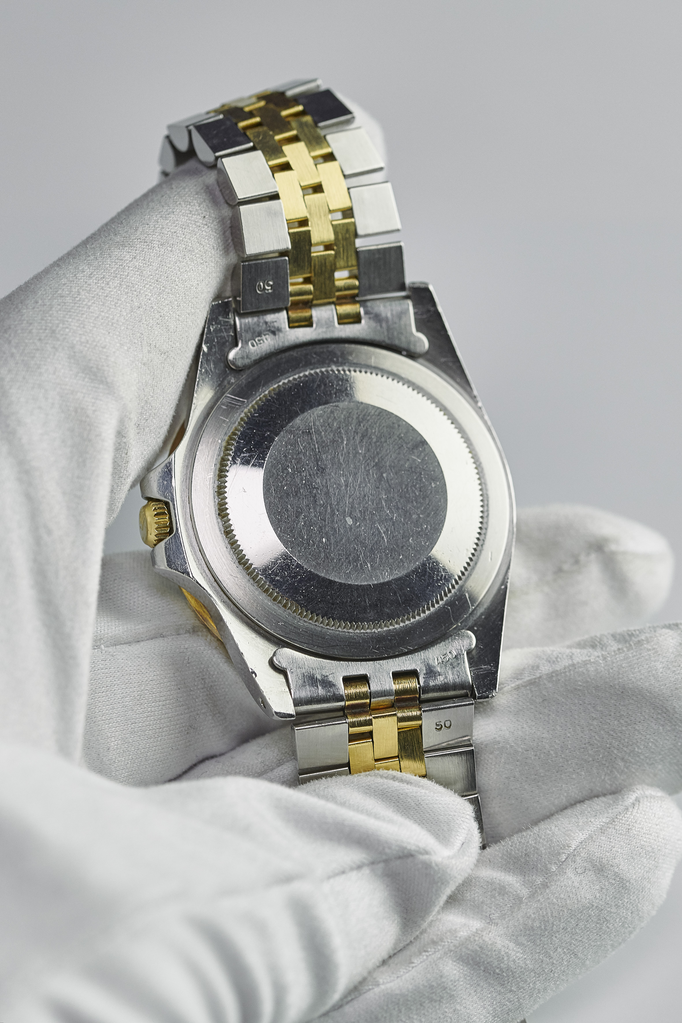 • Dial Black dial with applied gold-coloured "nipple" indices, date with magnifying glass at 3 o'clock, gold-coloured 24-hour hand, bi-directional rotating black gold-set 24-hour bezel, signed "Rolex GMT Master II"