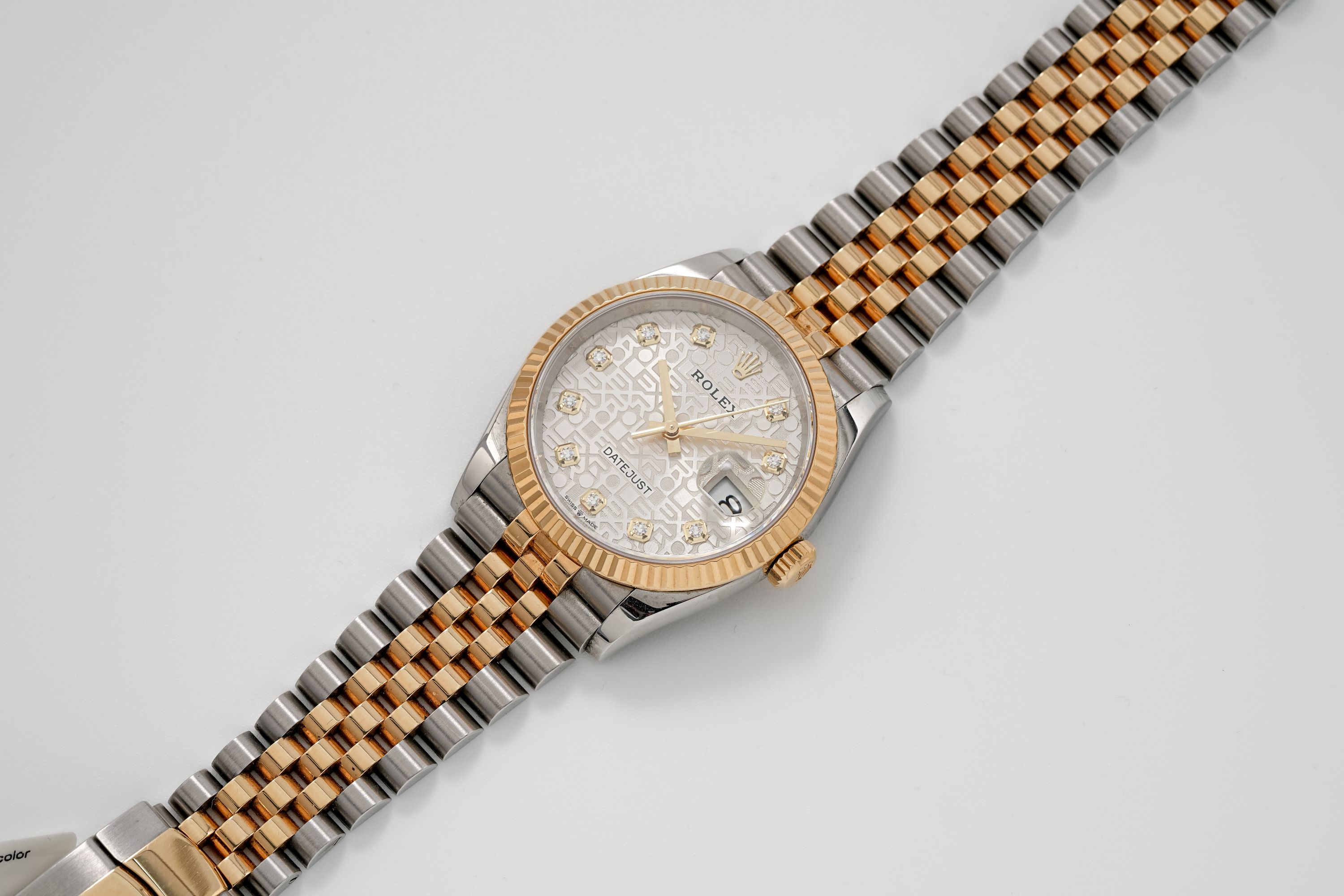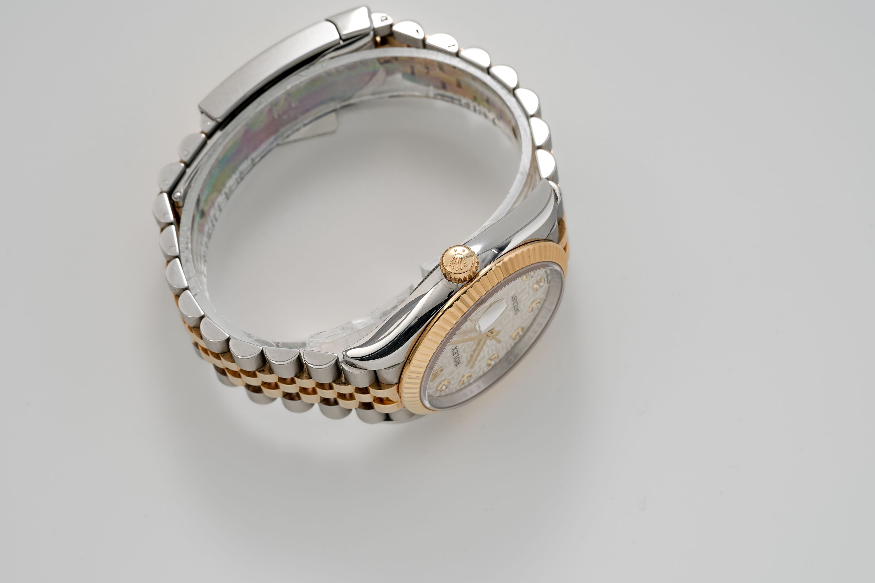 MovementCream sunburst dial with relief Jubilee motif, signed ‘Rolex Datejust’, applied Rolex coronet at 12 o’clock, polished and facetted ‘stick’ hour and minute hands, ‘stick’ central seconds hand, date aperture at 3 o’clock under Cyclops lens, applied gold indexes set with diamond, rehaut with laser-engraved ‘Rolex’ logos and Rolex coronet at 12 o’clock