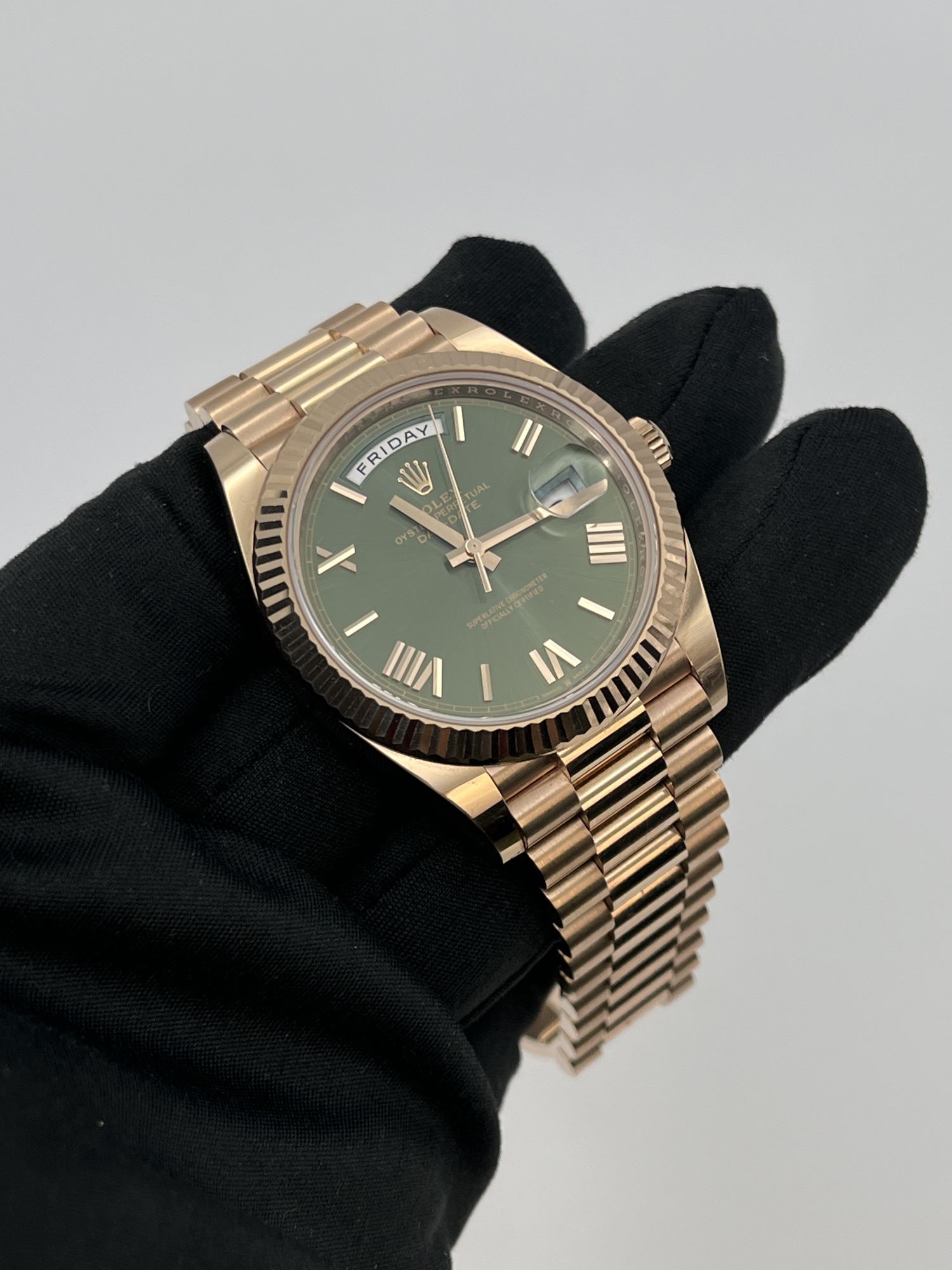 DialOlive green sunburst dial, signed ‘Rolex Oyster Perpetual Day-Date’, applied Rolex coronet at 12 o’clock, applied faceted rectangular 1, 5, 7, 9, 11 indexes and Roman numerals, polished faceted ‘stick’ hour and minute hands, ‘stick’ central seconds hand, date aperture at 3 o’clock under the Cyclops lens, weekday arched aperture at 12 o’clock