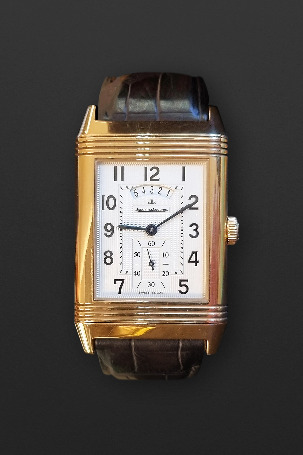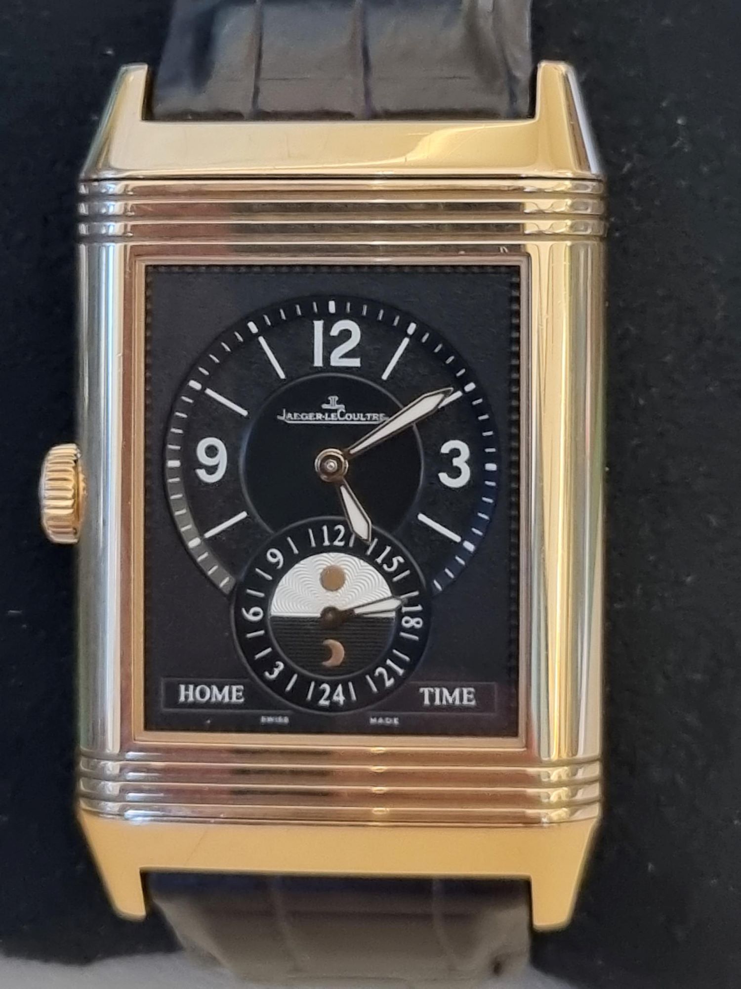 Dial‘Day’ side matt silvered dial, signed ‘Jaeger LeCoultre’, with ‘ligne’ and ‘Clous de Paris’ guilloche patterns, black Arabic numerals, inner minute track, blued ‘sword’ hour and minute hands, small seconds at 6 o’clock, arched date aperture at 12 o’clock, matt black ‘night’ side dial on reverse side signed ‘JL Jaeger LeCoultre Home Time’, luminous ‘sword’ hour and minute hands, luminous 12, 3 and 9 Arabic numerals, luminous ‘stick’ indexes, 24-hour day/night sub-dial at 6 o’clock with sun, moon symbols and luminous ‘sword’ hand